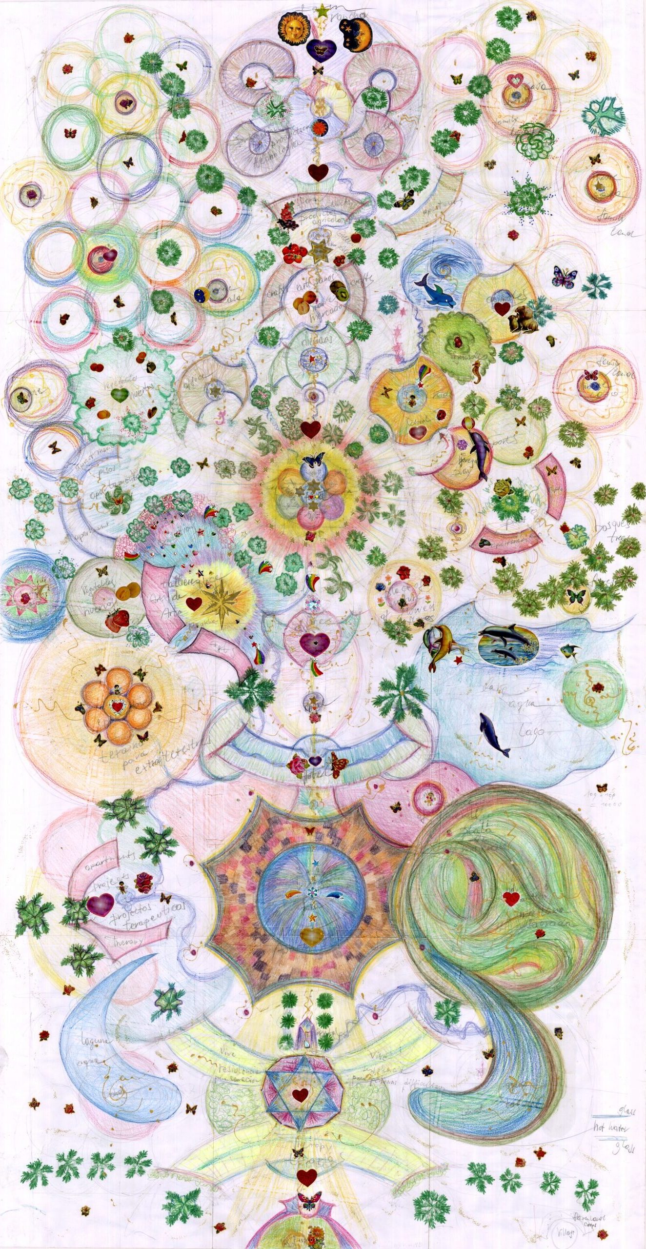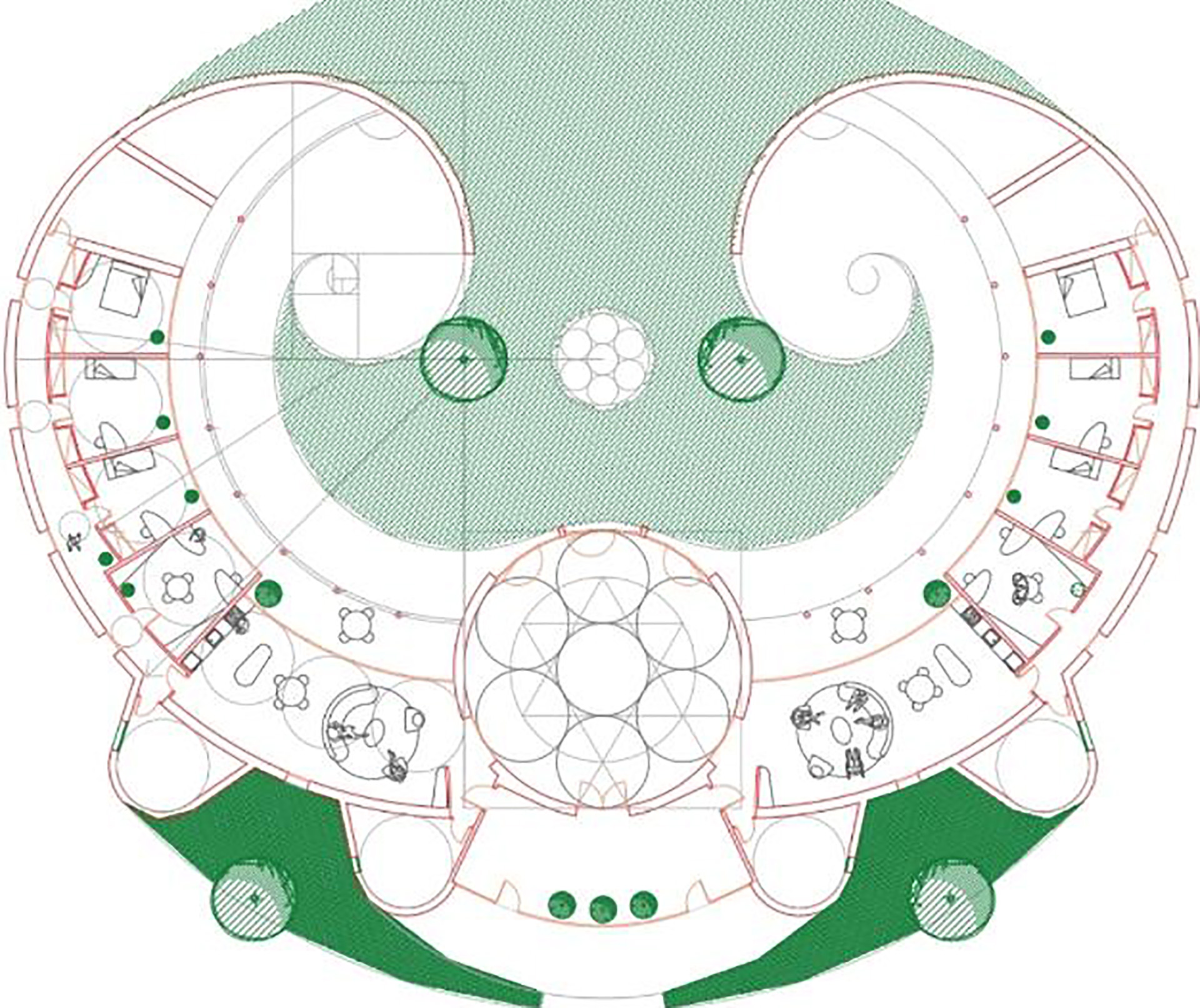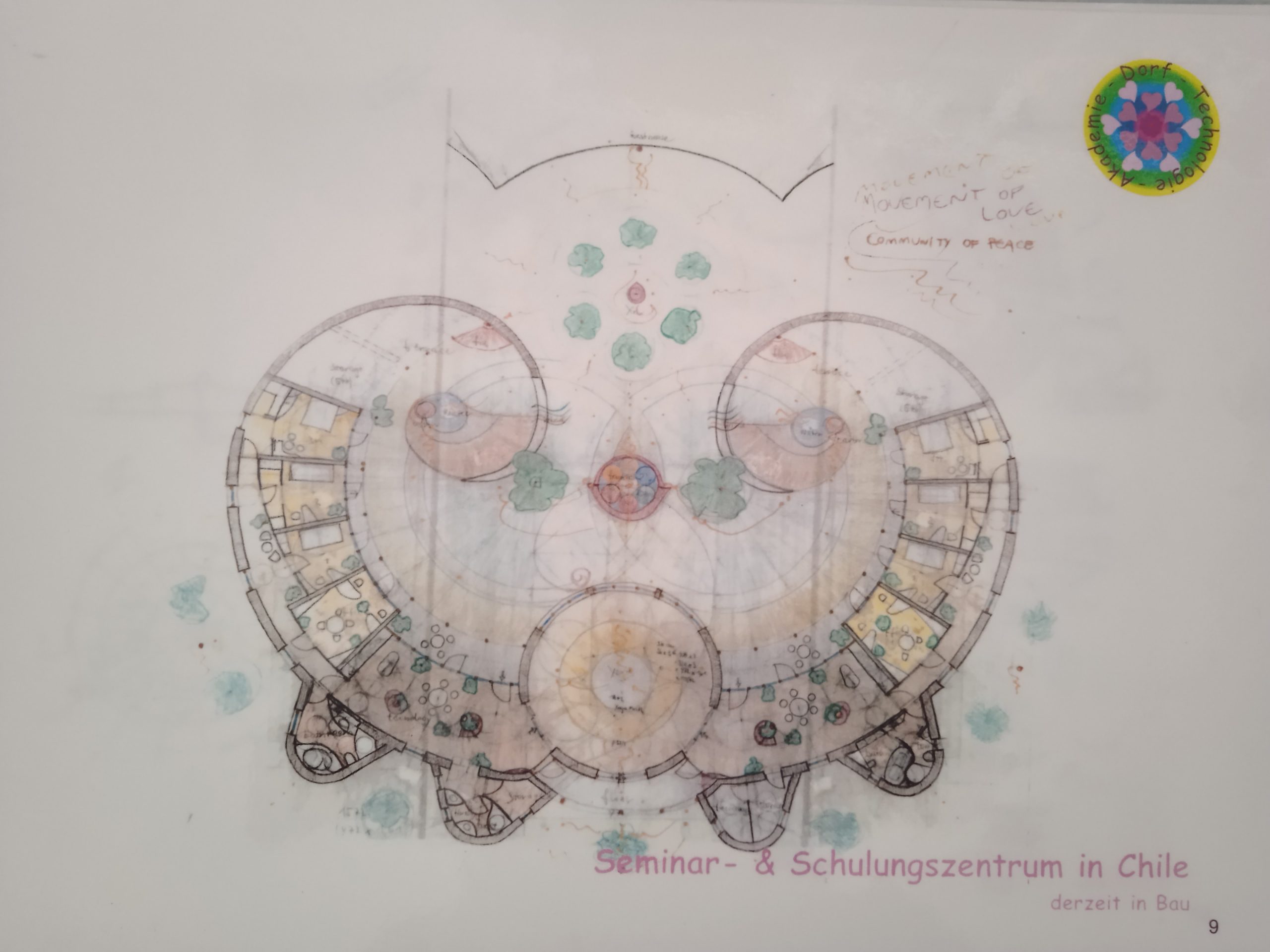 Living in peace and harmony with creation – living a life of fulfilment and love – is a dream of mankind. Now these dreams are becoming a reality – because some humans are reaching that state of consciousness which is needed to realize that dream. These people create a true community – which is based on just one rule – love. The project – is reflecting that dreams in its designs – and gives a group of people a home – reflecting their way of life..   The design The central round space – a call it a “Kiva –sacred Space”– serves as a spiritual centre for a community of 12 people (6 permanent residents plus 6 guests) – plus additional - also round - guest houses. Added to the centre circle – on both sides are two wings – the home for the two families – surrounding two interior gardens. The fundamental design shows two rings uniting with each other – creating Fibonacci Spirals – the fundamental law of design - in nature..